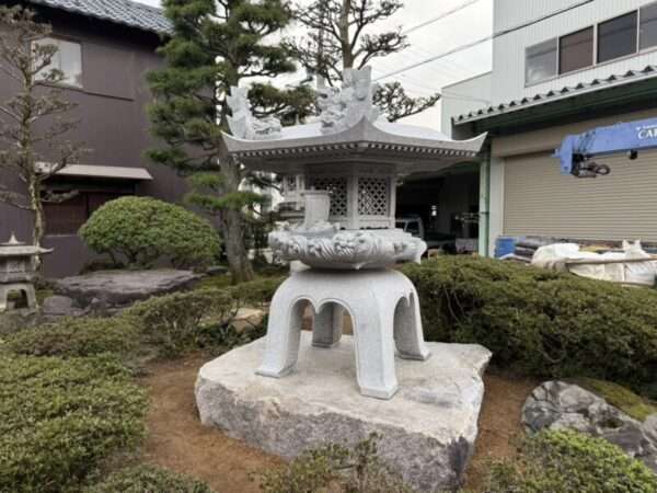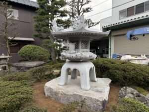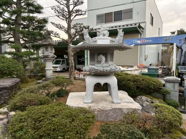 愛知県岡崎市から福井県坂井市まで配達をしながら、ご自宅のお庭に六角雪見型灯籠5尺(彫刻付き)を据付けさせていただきました。