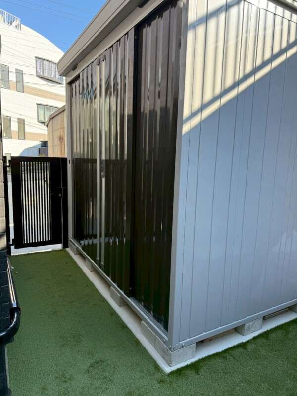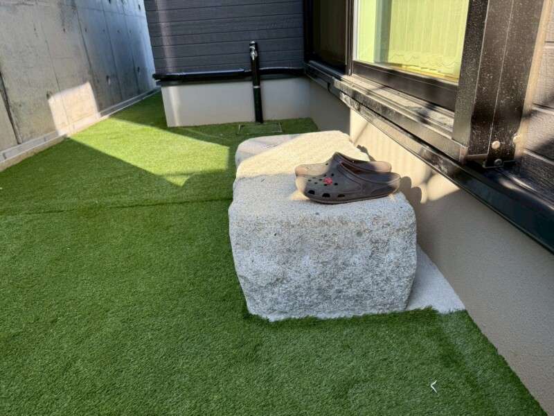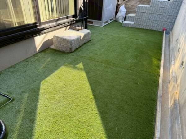 お庭に防草処理をして人口芝を敷きました。水受けも見えないように人口芝で見隠しをしました。