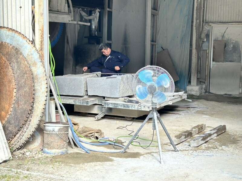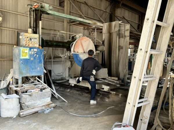 こんにちは☆ 石材切削前の寸法確認です!本日も石材切削をしていきます!石材切削をしながら加工作業をしてます!