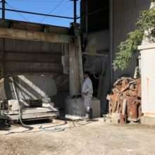 こんにちは☆ 今回の画像はワイヤソーでの石材切削の様子です(^^)/ ベテラン職人さんが原石(石材)を10トンリフトで載せ部材にを合わせて石材切削していき…