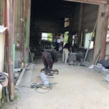 こんにちは☆ 今日の画像は墓石加工作業の様子です。1年生はサンダー(砥石)仕上げ、お墓の外柵を加工中、ベテラン職人さんはお墓の中台の水垂れ(ジャンプ台…