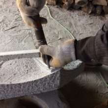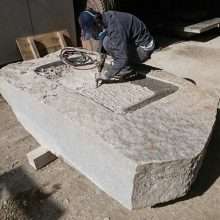 こんにちは☆ 今日の画像はノミ切り仕上げの様子です。職人さんが手作業でコツコツとノミと鎚(かなづち)を使って作業をします。石の表面にノミのあとが凸凹に…