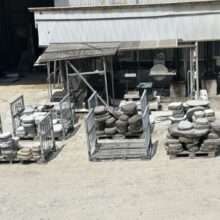 こんにちは☆ 今回の画像は工場にあります【飛び石】です(^^)/ 工場にあります飛び石です! 小さいサイズから大きなサイズ、厚みのある飛び石、石種も白色、緑…
